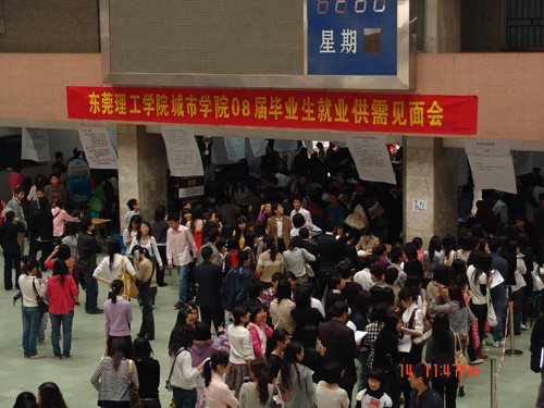 3月15日,城市学院2008年校园人才招聘会在4号楼大厅举行,我院和东莞理理工学院50多个专业的4000多名本(专)科毕业生到场应聘。一大早,前来应聘的学生就在东莞市工商银行等用人单位招聘点前排起了长龙。 举办招聘会旨在为毕业生提