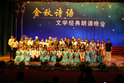 中央人民广播电台播音艺术家向东老师,表演艺术家、电视剧《西游记》续集猪八戒扮演者崔景富老师为同学们作即兴朗诵。 会后,领导与演职人员合影留念 10月29日,文学与艺术系在大礼堂隆重举行“金秋诗语”文学经典朗诵会。 本次