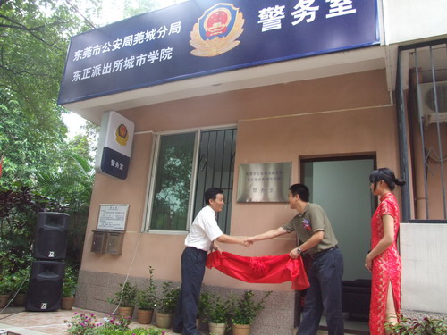 安少华院长和莞城公安分局局长吴晓(右)为警务室揭牌 张林副院长致词 学院、分局领导参观警务室 为进一步加强高校及周边治安防范和治安管理工作,密切公安机关与学院、民警与师生的关系,减少和预防校园治安