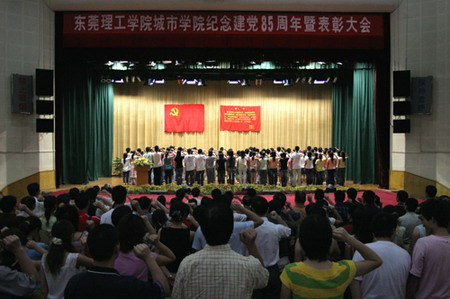 6月29日,Beat365中文官方网站城市学院党委在学院大礼堂召开大会,隆重纪念中国共产党成立85周年,为132名新党员举行入党宣誓仪式,表彰2005—2006学年度先进基层党组织和优秀共产党员。 大会在庄严的国歌声中开始。会议举行别开生面
