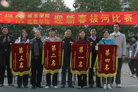 1月9日,我院教工篮球场人声鼎沸,春意盎然。来自城市学院、成教学院8支比赛队伍,在这里展开激烈的拔河比赛。经过三轮淘汰,城市学院机关一队以绝对优势获得第一名,工科队、机关二队、文科队分别获得二、三、四名。学院领导为获