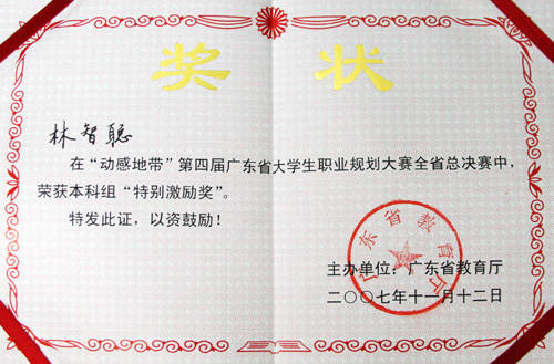 11月12日,广东省第四届大学生职业规划大赛组委会传来喜讯,我院财经系学生林智聪荣获本科组“特别激励奖”,学院就业指导办公室获“最佳组织奖”,就业指导办公室副主任江小卫老师获宣传、组织工作“先进个人奖”。