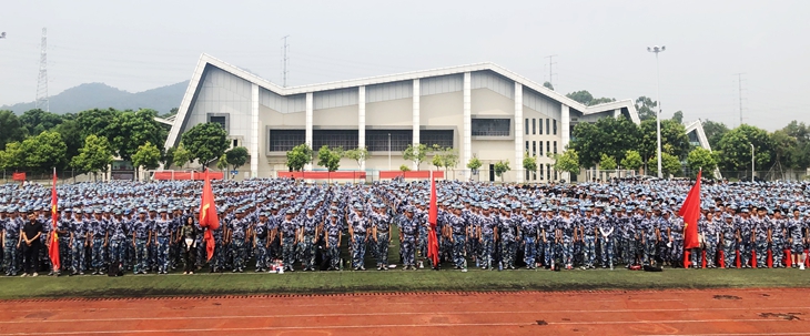 上午,5600多名军训新生在教官的带领下在运动场集中,军容整齐、志气昂扬。