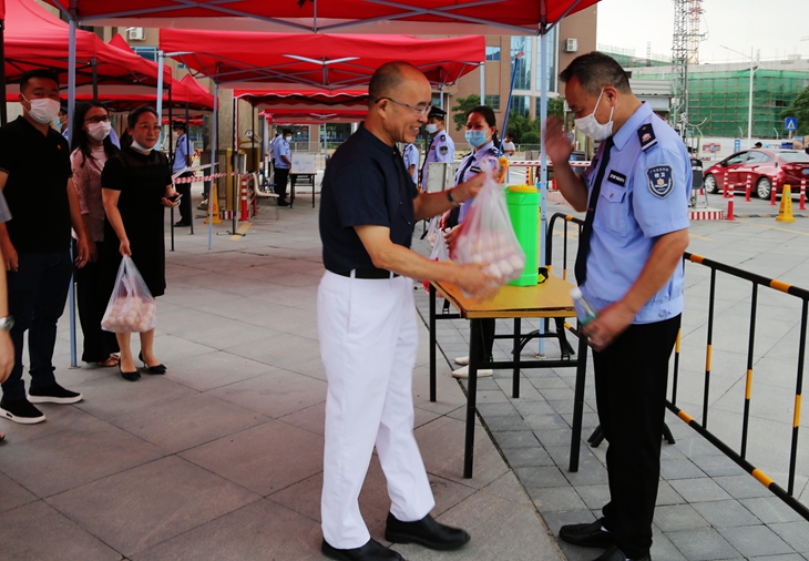 5月26日,王卫平校长在后勤保卫处副处长蔡小锋、刘维仝,组织部副部长卢淑芳的陪同下来到疫情防控一线,慰问后勤员工。