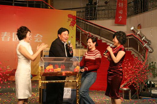 团拜会首先播放了由我院影视制作中心精心录制的《城市学院新闻联播年终特别报道》DV短片。DV短片回顾展示了城院过去一年的辉煌,再现了城院人前进的足迹。接着,各系部教职工纷纷登台,倾情献演了反映校园生活的歌舞节目。歌舞《恭喜发财吉祥年》“咚咚咚”的锣鼓声,拉开了团拜会文艺演出的序幕并赢得全场热烈的掌声。《革命人永远是年轻》、《草裙舞》、《大话城院》、《爱在城院》充分展示城院人以校为家、爱岗敬业的时代风采;《晨练》、《地方戏曲荟萃》、《举杯吧,朋友》等节目,把团拜会推向了高潮。