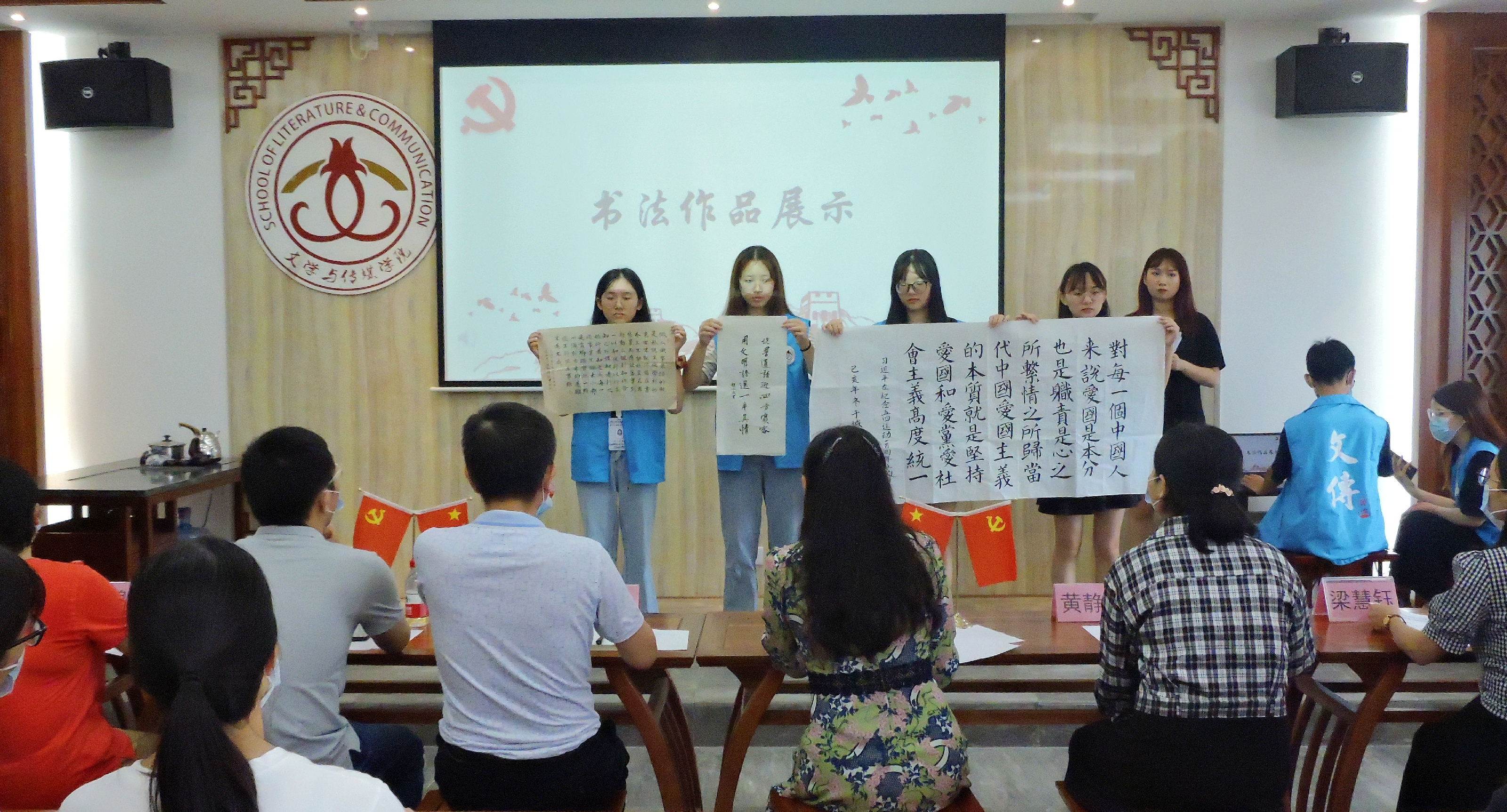 活动中,陈跃书记指出,汉字与普通话在历史演变过程中的变与不变,强调了写好汉字与说好普通话的重要性。随后针对“同讲普通话,携手进小康”主题进行了书法优秀作品和朗诵优秀作品的展示。陈如碧博士在书法作品点评中表示,书法功力的获得是日积月累循序渐进的过程,并非一朝一夕的事,希望同学们能够坚持练习,再接再厉。苗琳老师点评朗诵作品时提醒同学们要注意正确发音,同时还号召同学们“讲好中国故事,传播中国好声音”,主动挑起推广普通话的重担。