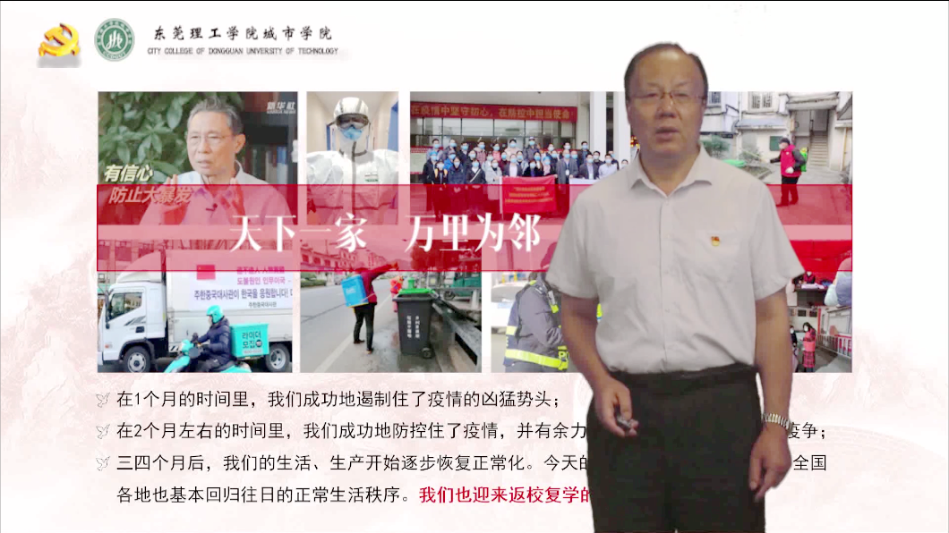 今年的开学第一课,学校创新采用录播形式,在校内各专业各年级思政课上播放,覆盖面广,同学们参与度高。通过书记第一课的学习,全校同学更加深刻地理解了中国抗疫战争是一部伟大的教科书,要在抗疫中通过不同的方式,作出自己的贡献。