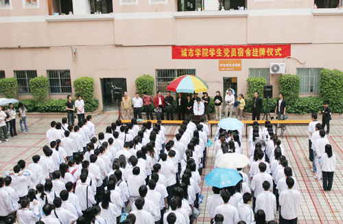 仪式上,朱冰副书记对此次挂牌的党员宿舍的同学提出了两点希望:第一,学生党员们要严格自律,成为学习和生活上的标兵,真正做到“一名党员一面旗帜”,为构建和谐校园和服务东莞地方经济作出贡献;第二,小小的“牌匾”既光荣,又象征着一份责任与义务,希望党员同学们要变压力为动力,积极树立党员意识,时时处处起模范表率作用,为同学们营造一个健康和谐的良好氛围。