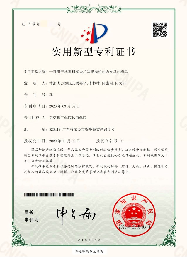 日前获悉,Beat365智能制造学院创新中心2016级学生林润杰、袁振廷等同学,独立申请专利“一种柑橘去芯除果肉机内夹具的制作方法”授权。两位同学是“攀登计划”和大创项目及挑战杯主力成员。