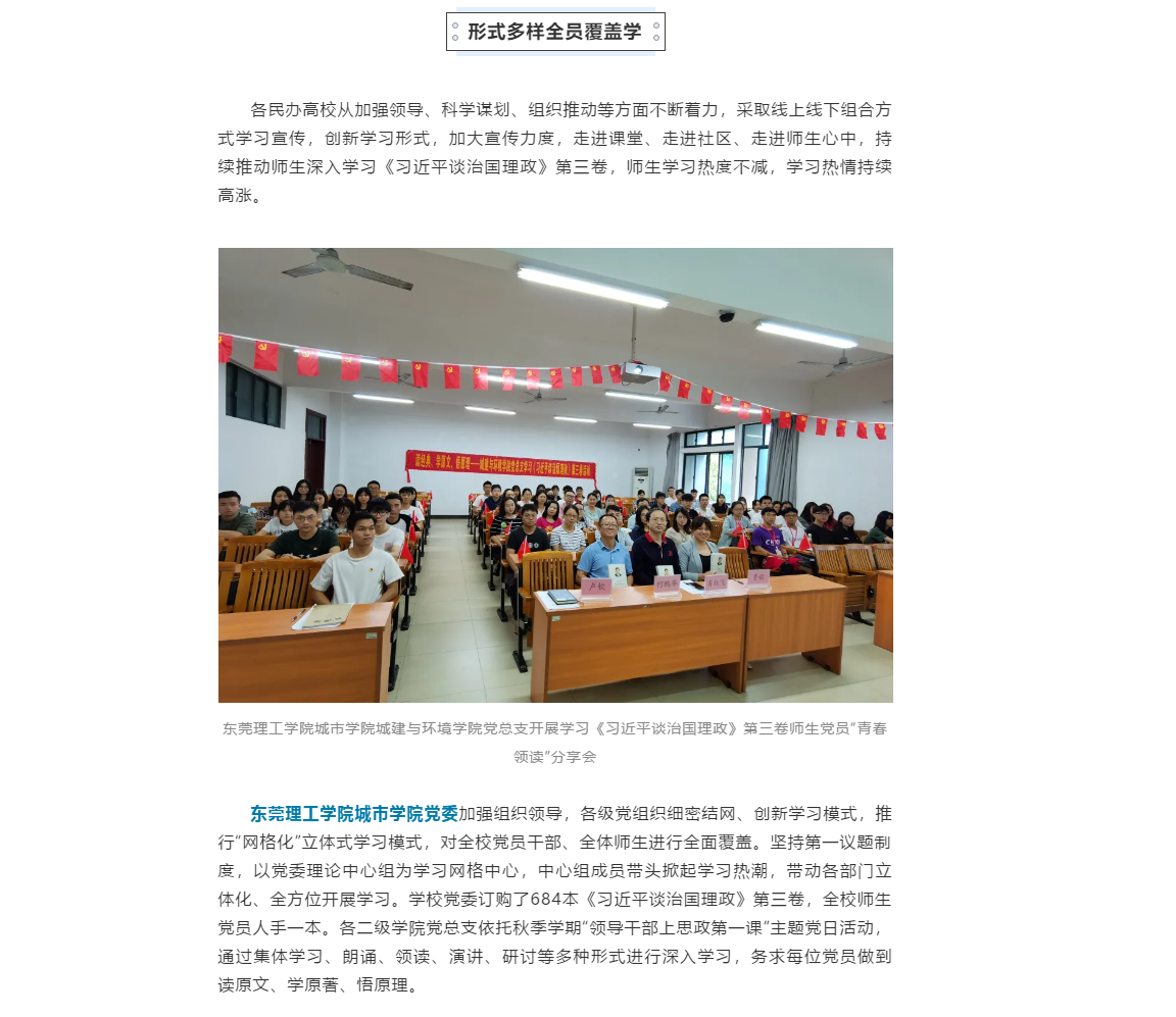 Beat365党委加强组织领导,各级党组织细密结网、创新学习模式,推行“网格化”立体式学习模式,对全校党员干部、全体师生进行全面覆盖。坚持第一议题制度,以党委理论中心组为学习网格中心,中心组成员带头掀起学习热潮,带动各部门立体化、全方位开展学习。学校党委订购了684本《习近平谈治国理政》第三卷,全校师生党员人手一本。各二级学院党总支依托秋季学期“领导干部上思政第一课”、主题党日活动,通过集体学习、朗诵、领读、演讲、研讨等多种形式进行深入学习,务求每位党员做到读原文、学原著、悟原理。