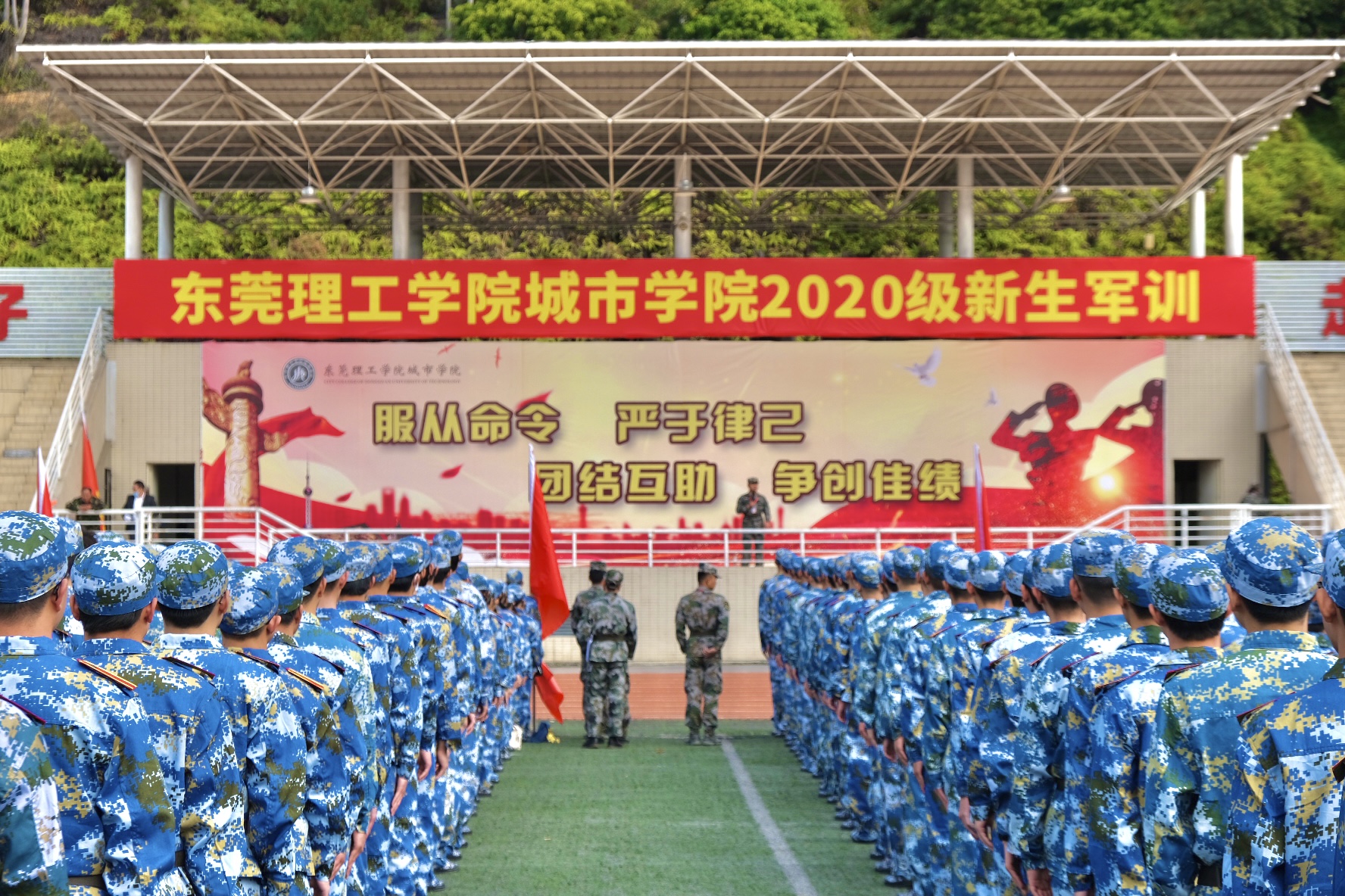 1月4日下午,Beat365在运动场隆重举行2020级大一学生军训开训仪式,2500余名学生将参加为期14天的军训,锻造品质,磨砺自我。东莞市国防教育训练基地主任林东生、训练部部长彭亮,学校校长王卫平、党委书记章德胜、副校长高香林、广东鸿发教育集团公司副总经理李奎山等领导,以及军训团成员,各营、连、排军训教官及指导员出席开训仪式。