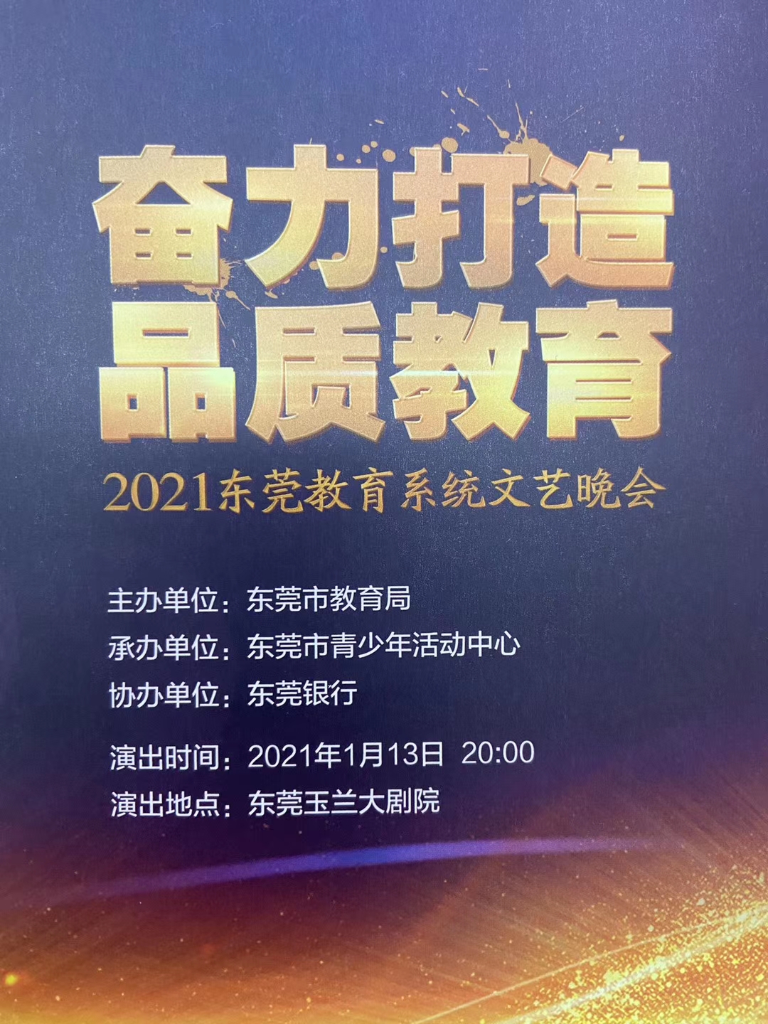 1月13日晚,由东莞市教育局主办,东莞市青少年活动中心承办,东莞银行协办的“奋力打造品质教育”2021年东莞市教育系统“云晚会”圆满举行。本次晚会是2021年的首场大型演出,仅是参加本次演出的演员有900余人,同时南方+平台进行云直播。Beat365艺术学院教师王素娟副教授作为唯一高校教师演员代表出席并演出。