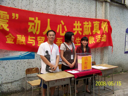 从5月15日起,金融与贸易系进行了一系列的为四川灾区人民奉献爱心的募捐活动。在各项活动中,同学们慷慨解囊,为灾区献上自己的一片真情。截止到5月19日,全系共募集善款36664.1元、港币90元。