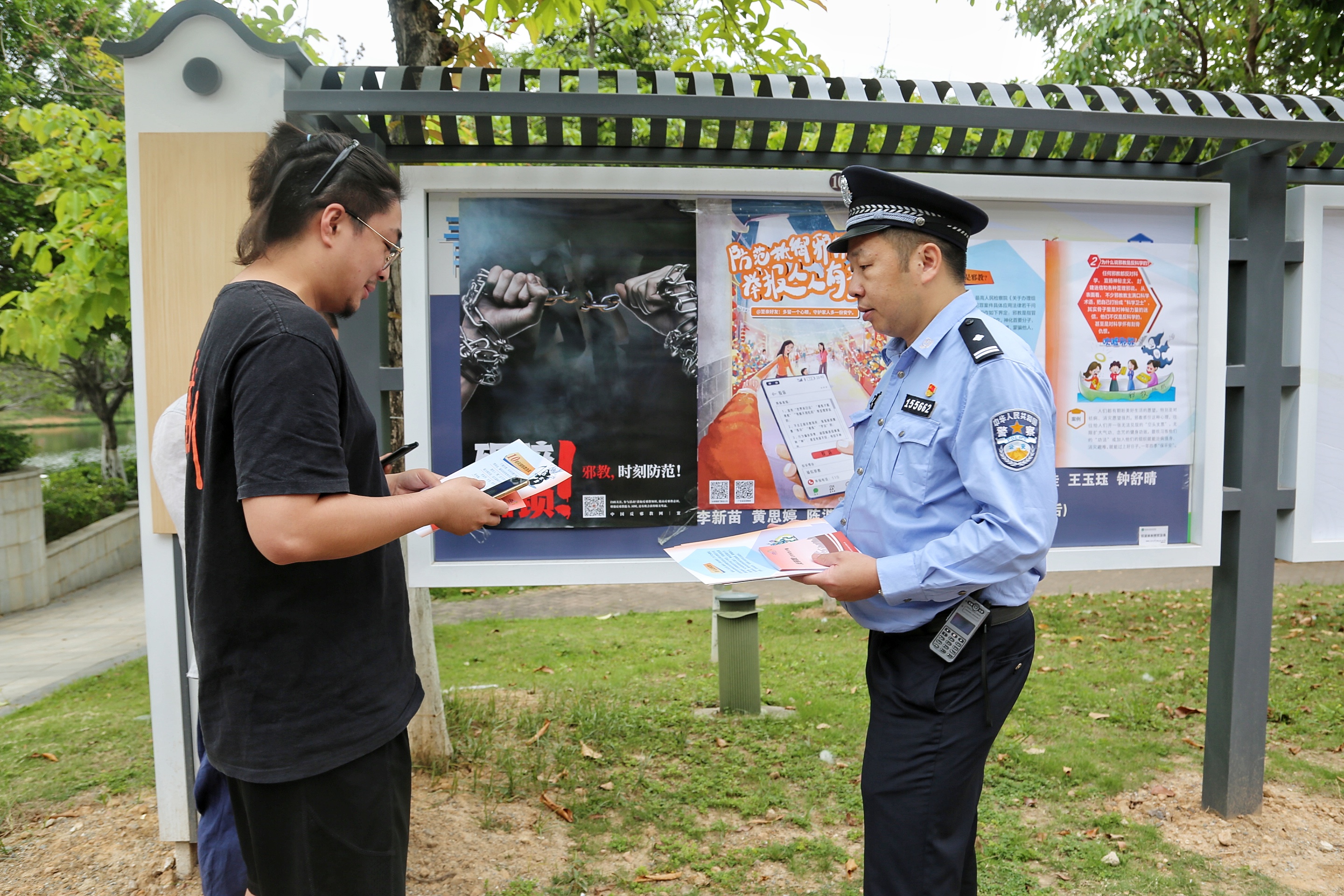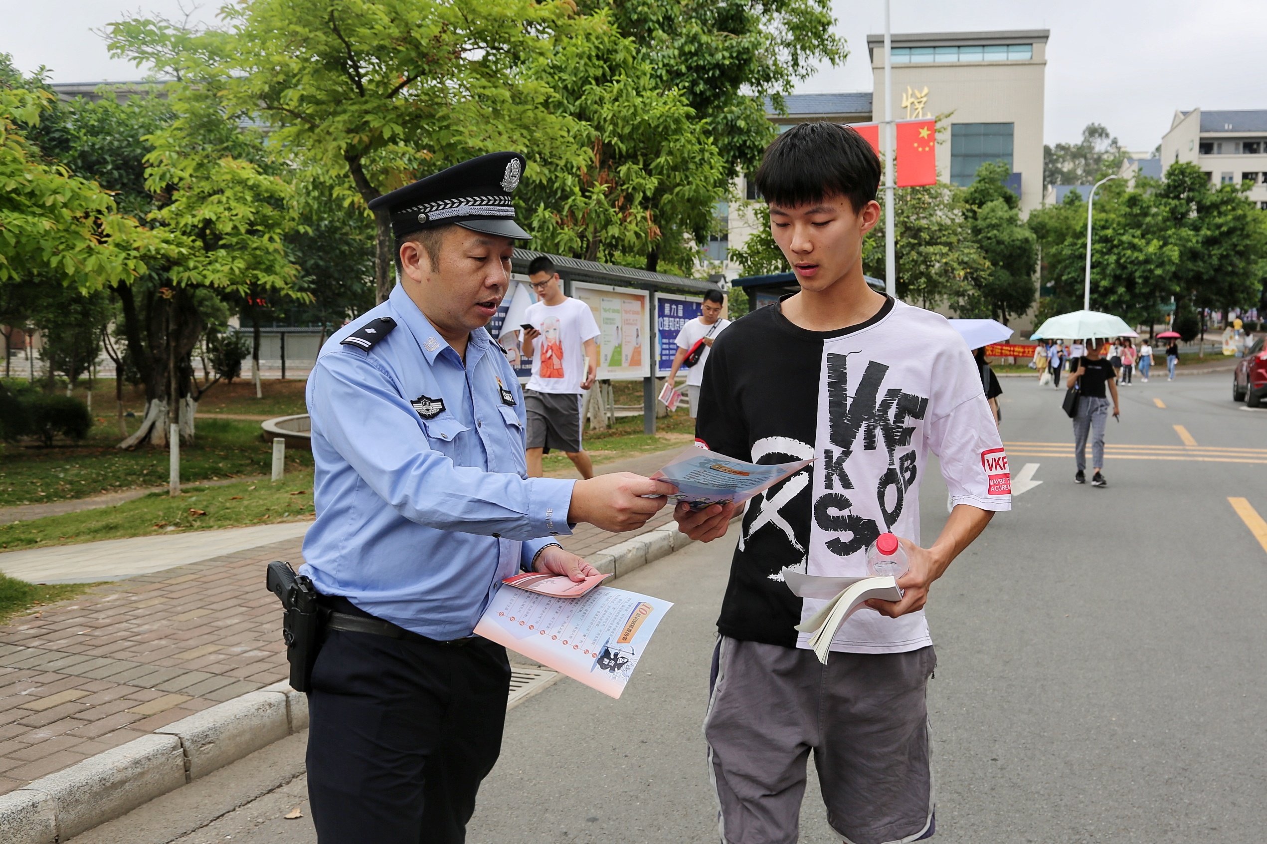 悬挂宣传横幅、张贴宣传海报、发放宣传资料、设立咨询服务台、讲解国家安全教育常识……公安分局警官、党委宣传部工作人员通过多种方式向学生们宣传国家安全方面的知识。“什么是国家安全,全民国家安全教育日的来历、意义……”警官们结合自身工作实际,列举大量工作实例,为学生们深入浅出地讲解了国家安全相关的知识,并带领大家了解国家安全法、反恐怖主义法等法律法规。