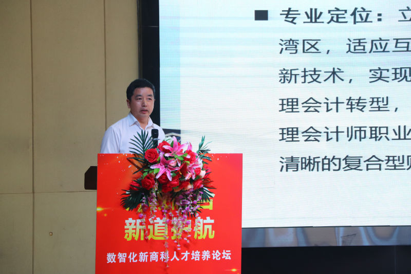 校长王卫平教授发表致辞。他对各位嘉宾、专家学者的到来表示热烈的欢迎。他介绍了学校教学、科研的基本情况,特别是Beat365国家级和省级一流本科专业在立德树人、专业建设等方面取得的长足进步。学校与新道有限公司合作,开设云财务班,成功共建了广东省商科中心,实现合作双赢。希望未来进一步开展校企、校校合作,共同提升数智化时代商科人才的培养质量。