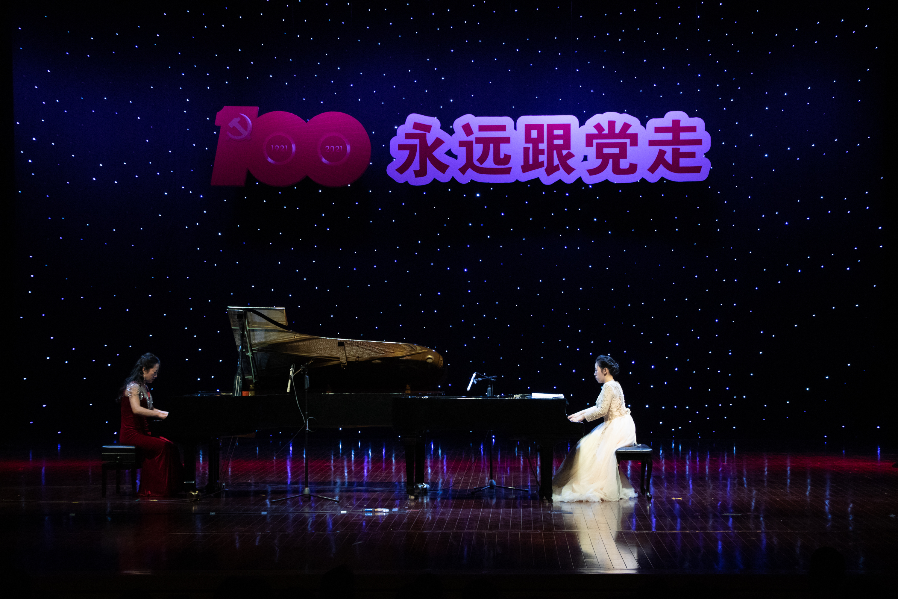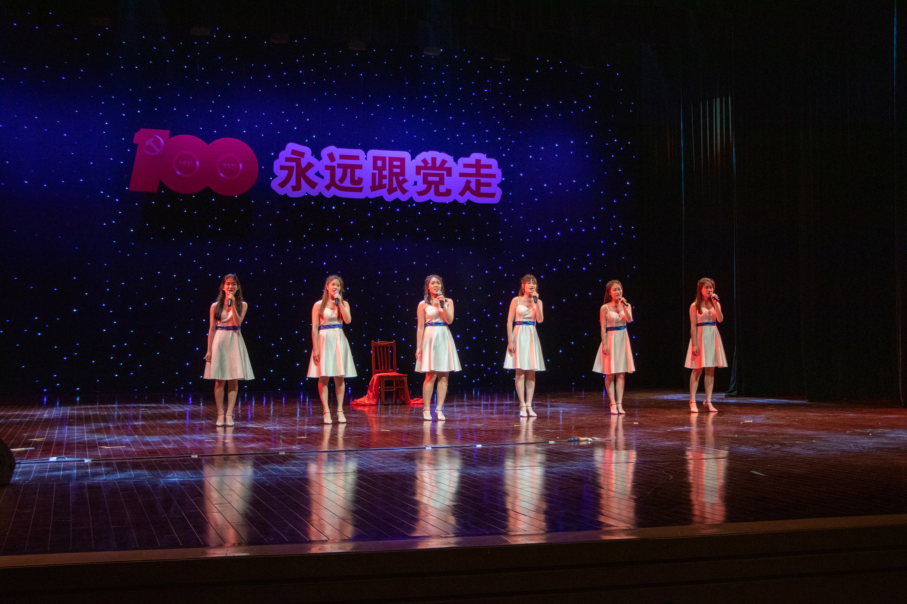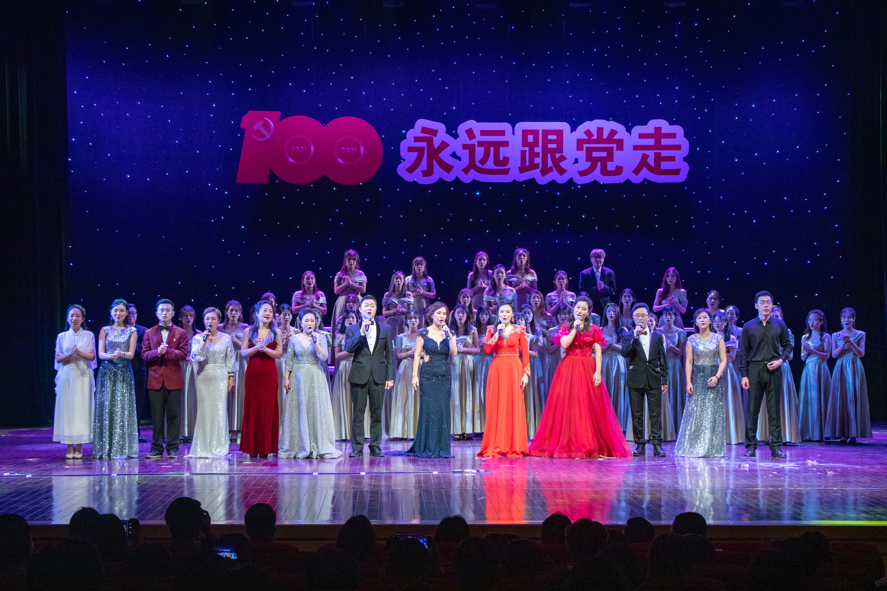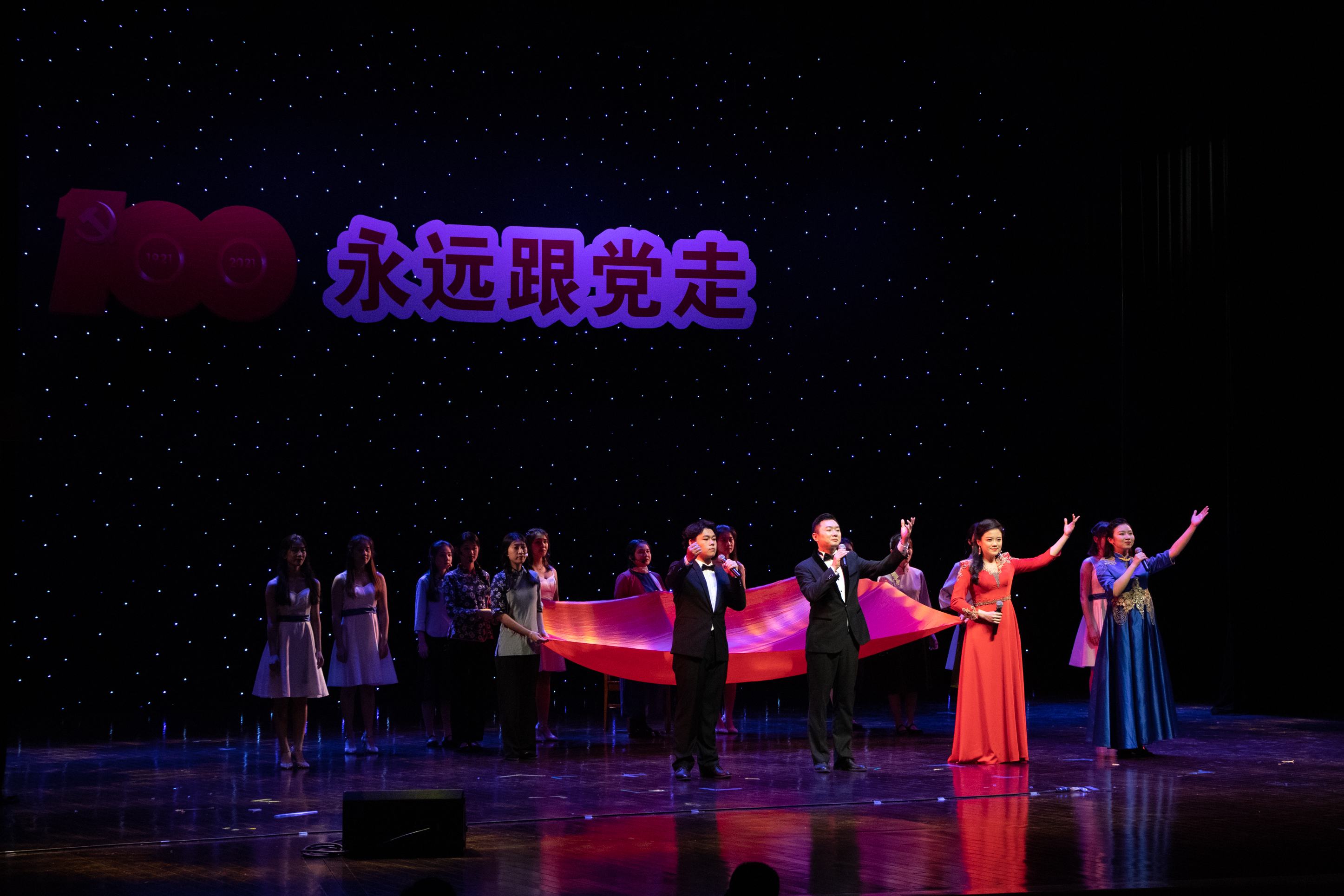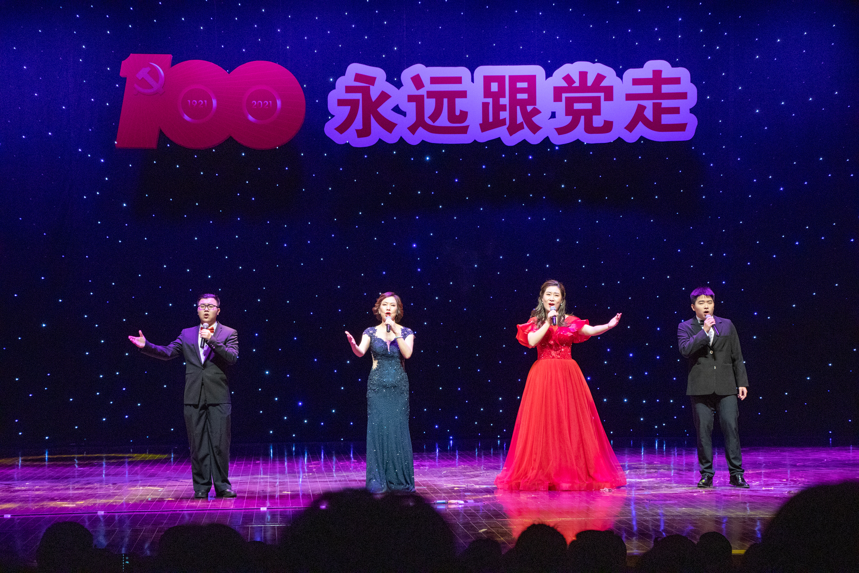 康慧丽、刘倩等4名老师带来的《跟你走》,通过悠扬的歌声,表达了人民像孩子一样,党像妈妈一样。牵着妈妈的手跟你走,歌颂了党在开辟的道路越走越宽广,每一名党员把眷恋的祖国装进心宇,以生命随党去万里远航。