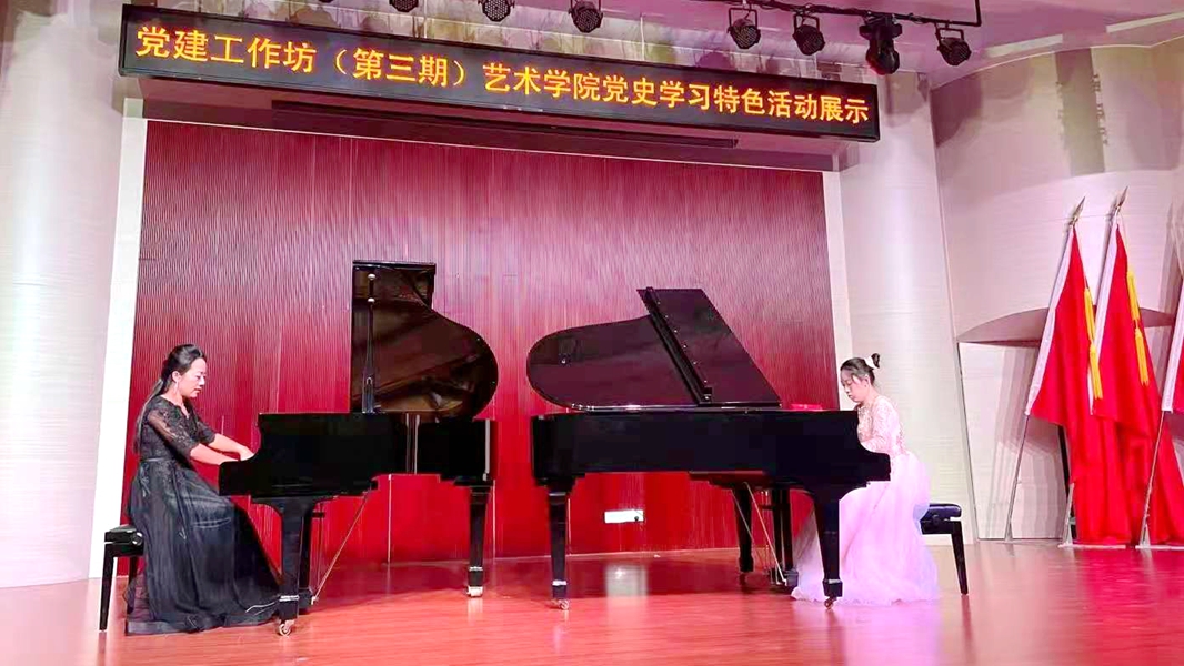 随后,大家观摩感受了艺术学院的党史学习活动展示环节。艺术学院器乐、表演及舞蹈等专业教师,“讲”与“演”结合,以及作品展演为引,讲述了作品中所蕴含的党史故事和革命精神。在“演”的环节中,