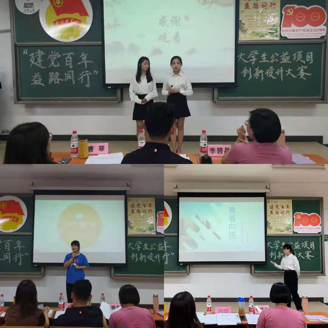 2021年5月13日下午,第四届“建党百年,益路同行”大学生公益项目创新设计大赛复赛在7C303课室召开。参加本次复赛的有法学院团总支书记段昭老师,社会工作专业曹琴老师、李碧晶老师和另外15支入围队伍。