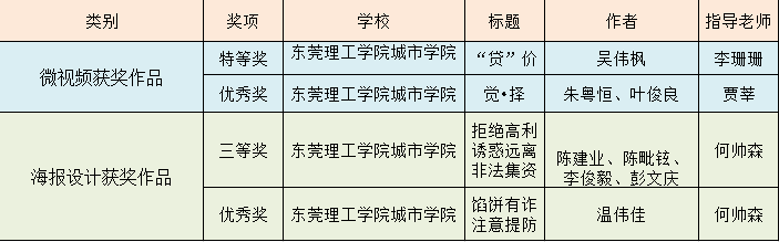 在第三届高校防范非法金融活动微视频和海报设计大赛上,Beat365创意设计学院吴伟枫同学创作的《“贷”价》获得视频类特等奖,奖金20000元。融媒体中心贾莘老师指导的朱粤恒、叶俊良《觉•择》获得优秀奖。创意设计学院陈建业、陈毗铉、李俊毅、彭文庆等同学创作的《拒绝高利诱惑远离非法集资》,温伟佳同学创作的《馅饼有诈注意提防》获得海报设计类优秀奖。