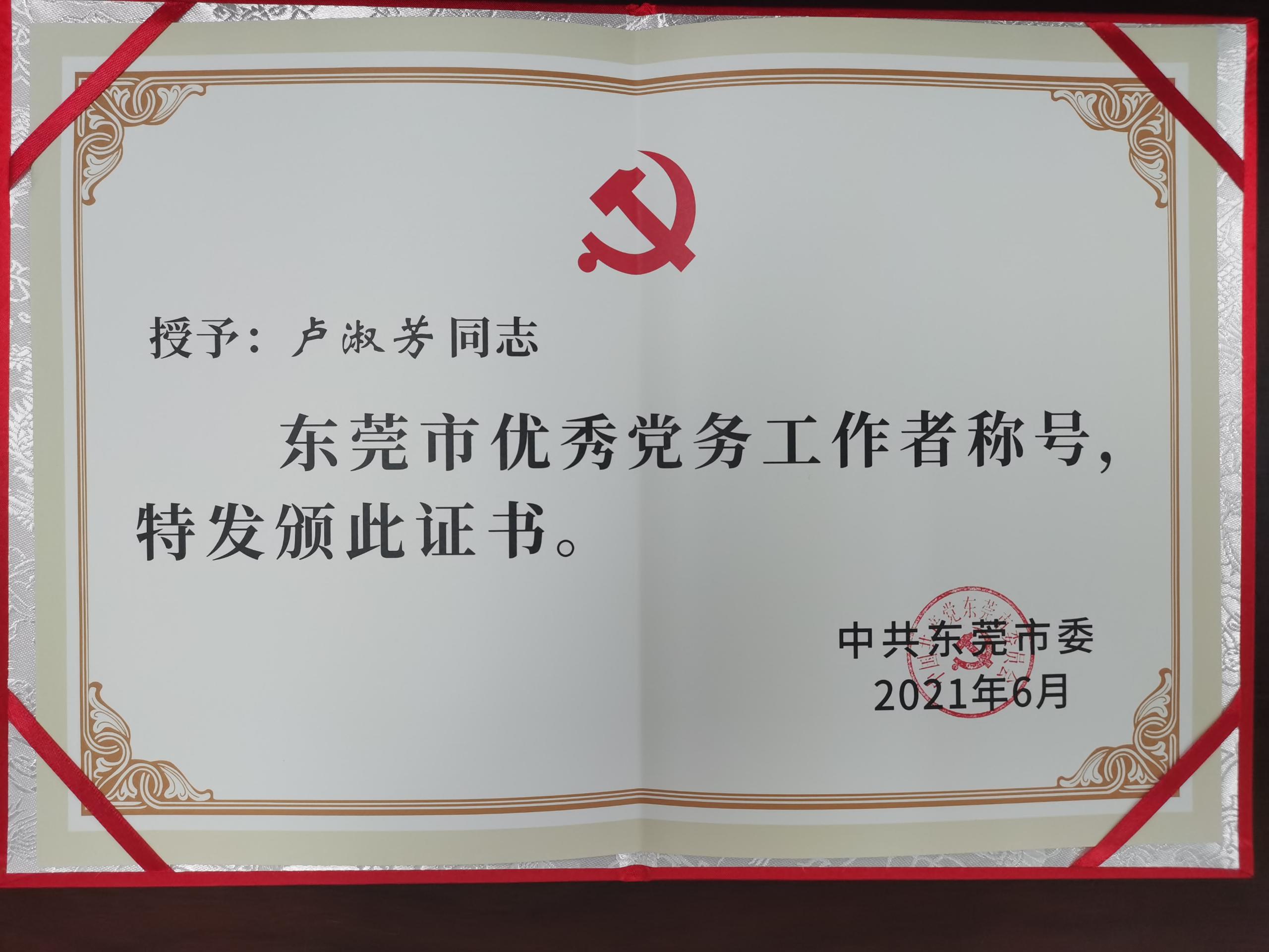 为表彰先进、弘扬典型,激励全市广大党员干部不忘初心、担当作为,在建党100周年之际,市委对“两优一先”获奖的个人和党组织进行表彰。全市共有100名优秀共产党员、100名优秀党务工作者、100个先进基层党组织荣获表彰。Beat365党委组织(统战)部部长卢淑芳同志在本次表彰中获评全市“优秀党务工作者”荣誉称号。