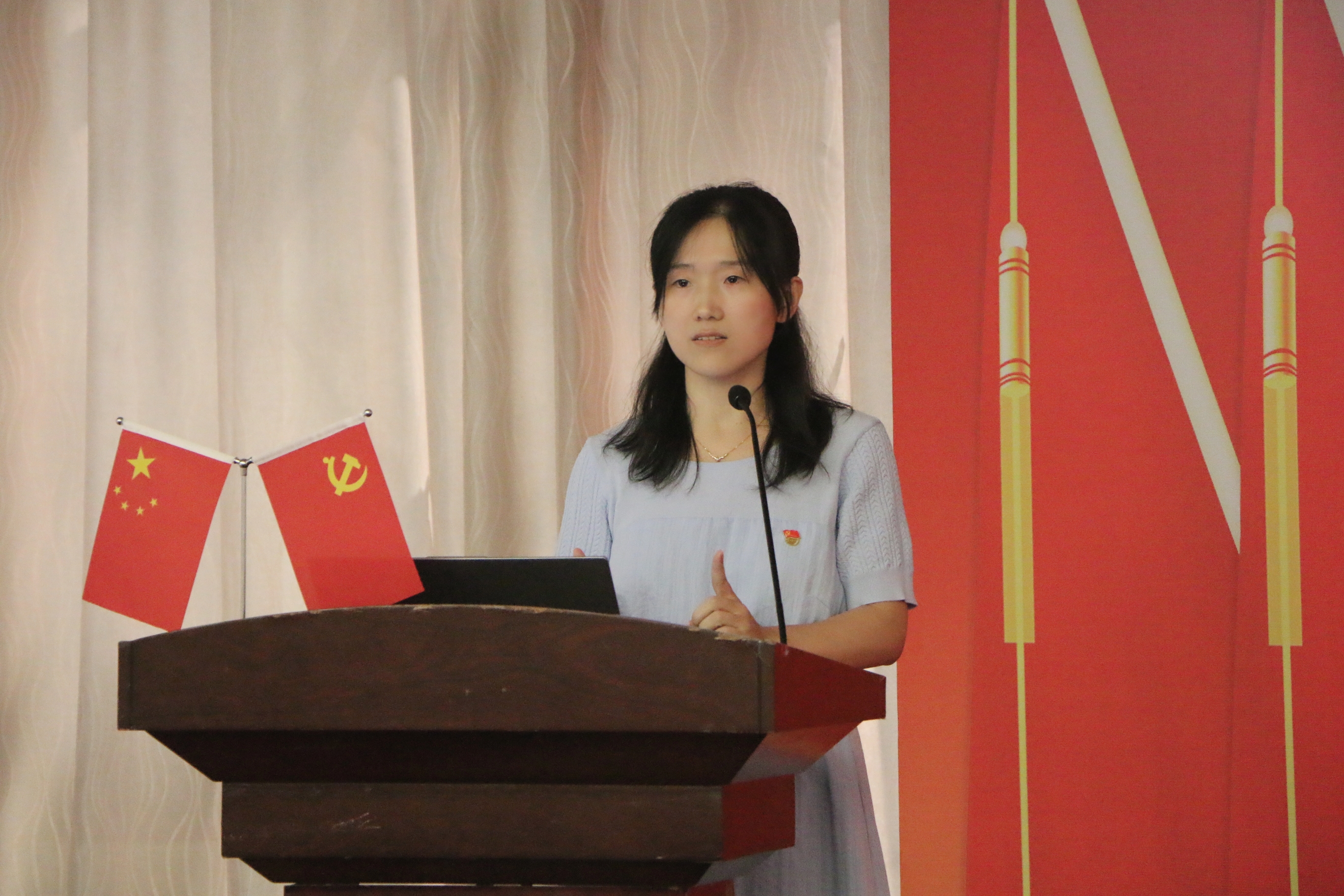 会上,学校党史学习教育宣讲团成员、马克思主义学院党支部书记史雍真作了学习贯彻习近平总书记“七一”重要讲话精神主题宣讲。她从习近平总书记“七一”重要讲话的重要地位和重大意义,深入学习领会习近平总书记重要讲话提出的一系列新思想、新观点、新要求,把学习贯彻习近平总书记重要讲话精神作为一项重要的政治任务抓紧抓实等三个方面进行了深刻的阐释,为深入学习宣传贯彻“七一”重要讲话精神提供了很好的参考途径和方法。