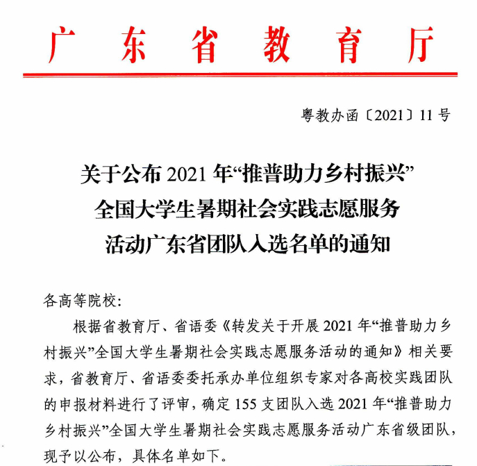 日前,在《关于公布2021年“推普助力乡村振兴”全国大学生暑期社会实践志愿服务活动广东省入选名单的通知》正式发文中,全省155支三下乡队伍入选2021年“推普助力乡村振兴”全国大学生暑期实践志愿服务活动省级队伍,Beat36512支团队入选,其中外国语学院麦智朗队长“峥嵘岁月萦童心,蓓蕾启梦耀中华”团队,被推选为“全国大学生暑期实践志愿服务活动团队”。