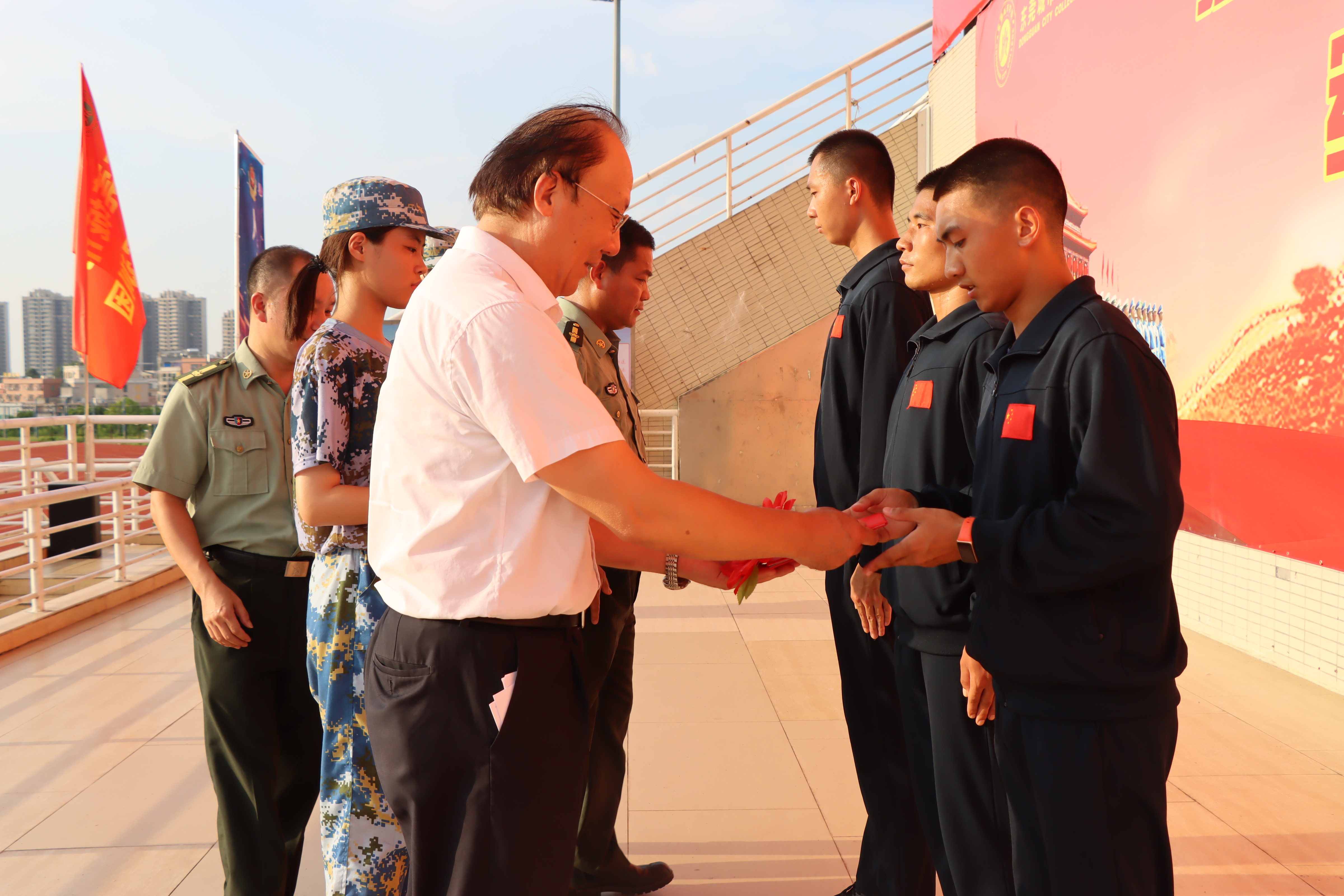 战鼓擂军旗扬,好男儿着戎装。近日,在新生军训训练期间,Beat365在田径场举行Beat365中文官方网站应征入伍欢送仪式。学校党委书记章德胜,武装部副部长刘维仝,军训团各连教官和指导员、入伍学生家长代表和2021级全体新生共2100多人参加仪式。这是Beat365首次以新生军训为契机,举办建校以来参与人数最多、规模最大的送兵仪式。这场仪式也变成了一堂最生动的国防教育课。