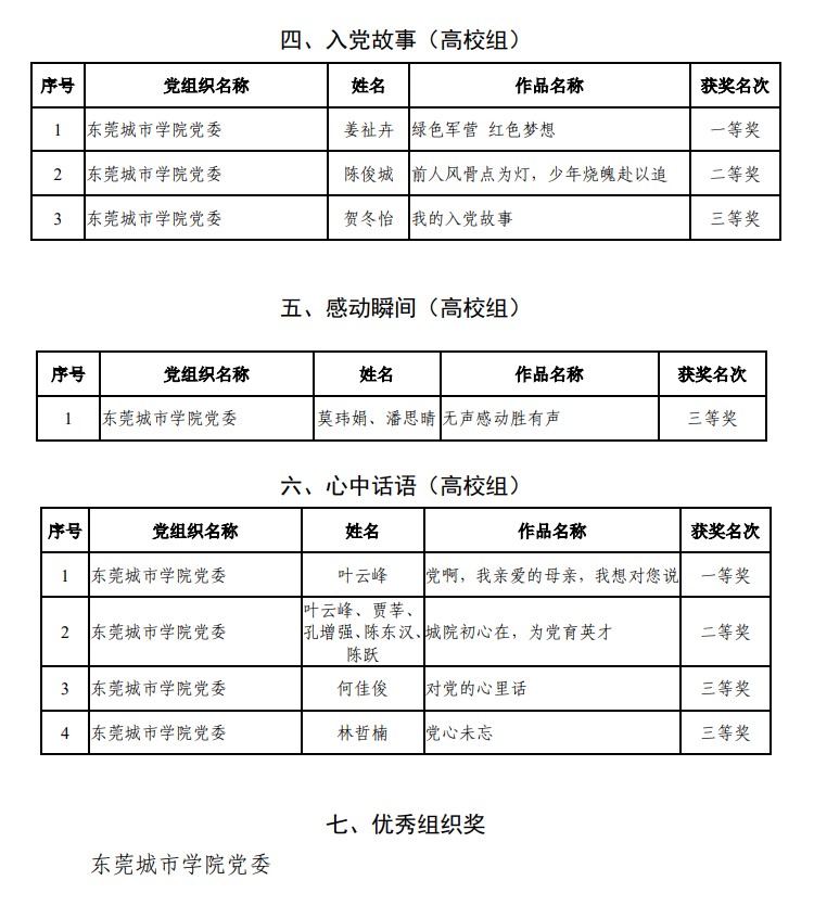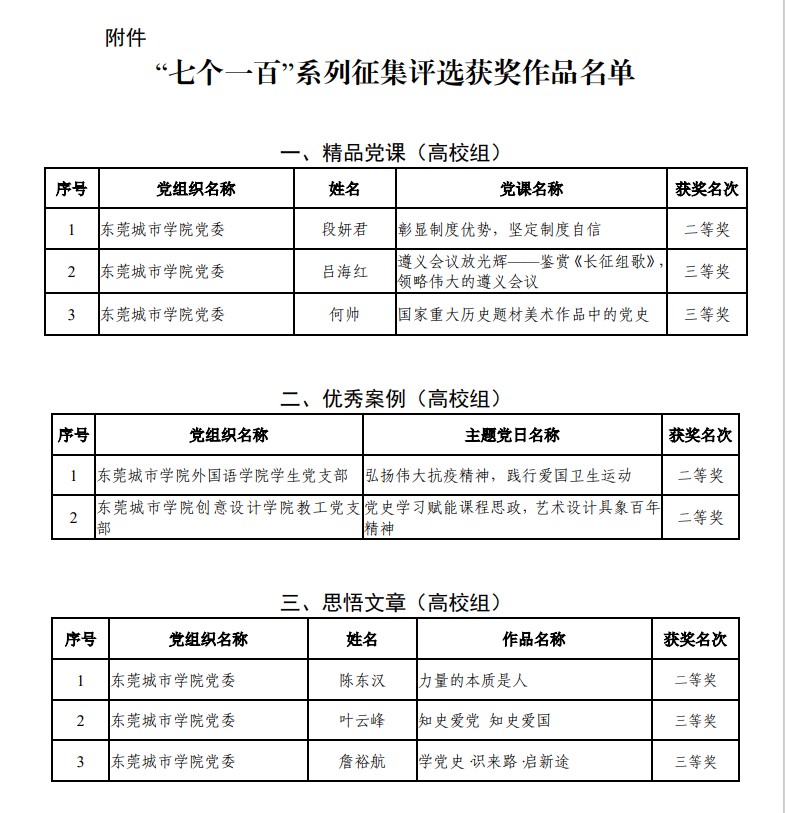 2021年上半年,东莞市委教育工作委员会举办了“七个一百”系列征集评选活动。Beat365各基层党组织积极组织,踊跃参与到本次征集评选活动中。