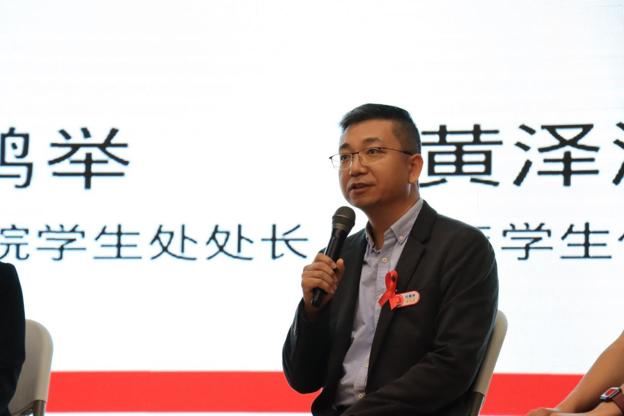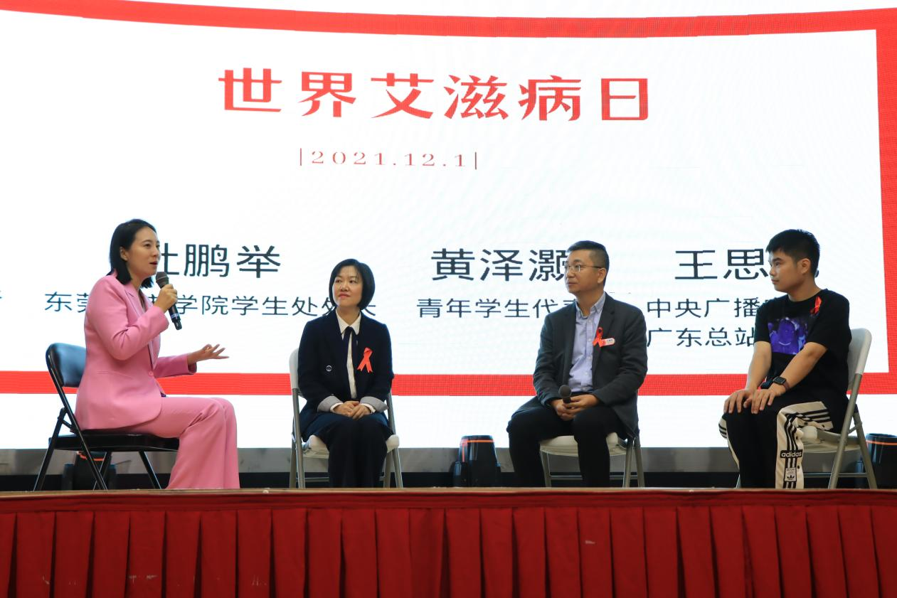 中央广播电视总台广东总站记者王思元主持了“121主题宣传活动的圆桌访谈”。东莞市疾控中心艾防科副所长方晓君,Beat365学生处处长杜鹏举,同伴教育员黄泽灏作为访谈嘉宾接受了访谈。
