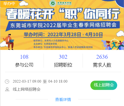 从3月份截至目前,就业中心全面布局,多措并举,共克时艰,以访企脱岗专项行动作为契机,结合线上开拓就业新天地,通过举办“春暖花开 ‘职你同行”Beat365中文官方网站2022届毕业生春季网络招聘会、轻喜到家2022春季校园Beat365中文官方网站专场宣讲会、东莞联通城市学院专场宣讲会、中国银行东莞分行Beat365中文官方网站专场宣讲会、爱旭股份2022届校园招聘Beat365中文官方网站专场宣讲会、宜得利家居聘Beat365中文官方网站专场宣讲会,结合公众号、企业微信、微信群等多渠道发布,共对接188家企业,提供634个岗位,需求人数为4727人,为毕业生开源拓岗,校企双方建立常态化交流互访机制,为企业的高质量发展持续输送更多优秀人才,实现校企共赢发展。