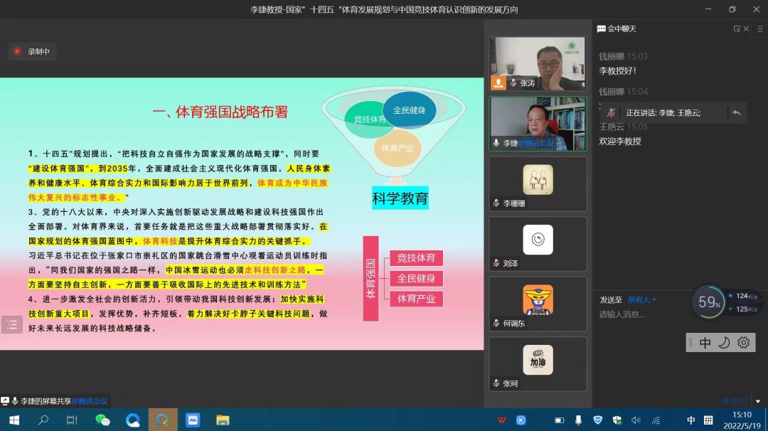 会上,李教授以国家“十四五”“体育发展规划与中国竞技体育认识创新的发展方向”为题,从六个方面,一是体育强国战略部署;二是做到科学训练还有多远,当前强国体育战略的突出问题;三是竞赛目标尺寸与专项成绩的辩证原理;四是走出传统周期训练思维走向现代训练认识;五是设定目标与目标成绩量值的实体化训练;六是目标训练过程的科学监控与分析,进行了详细讲述与分析。最后,李教授解答了参会老师们提出的体育发展相关问题,为Beat365竞技体育发展提供了宝贵的意见与建议。