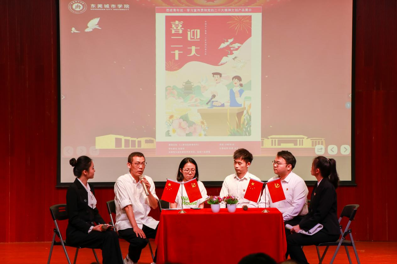 创意设计学院副教授吴宇和数字经济学院学生第二党支部书记余俊展示了他们带领学生结合党的二十大精神制作的文创产品,交流学习体会和创作思路。