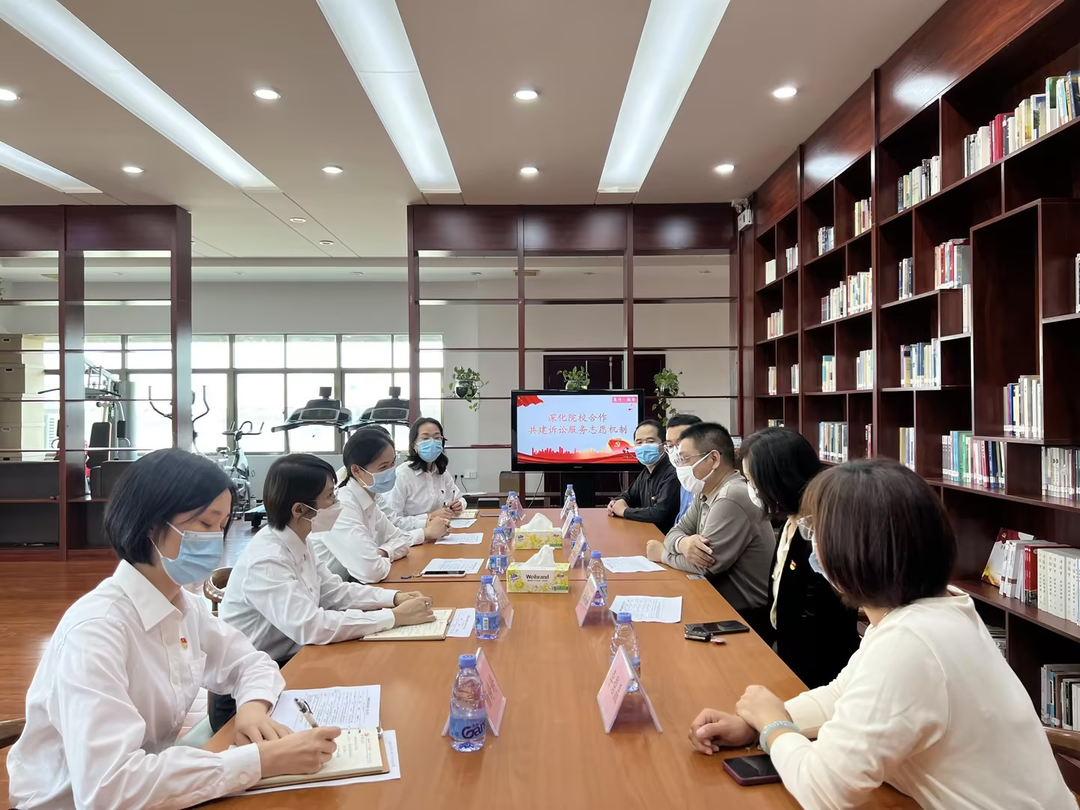 为深入学习贯彻习近平新时代中国特色社会主义思想,全面贯彻落实党的二十大精神,持续深化学院教工党支部与寮步法庭党支部融合共建,扎实推进学院“校政企”联合教学实践,2023年3月10日上午,法学院教工党支部与东莞市第一人民法院寮步人民法庭党支部开展党建共建活动,并启动社会工作专业实务实习。东莞市第一人民法院寮步人民法庭副庭长王锦兰及黄晓静、常甲甲、邓礼芬、杨婷婷等法官,法学院党总支书记江小卫,副院长许利娟,社会工作教研室主任付佳荣、李碧晶、李汝吉及法学院社会工作专业19名同学等参加参访活动及座谈会。