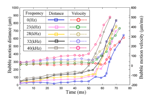 为此,肖健博士带领研究团队利高速相机对微细通道流动沸腾气泡运动特性进行研究,利用图像处理技术建立气泡追踪算法、气泡运动速度计算算法,研究气泡的生长、轨迹、速度和移动距离,定性和定量地描述微细通道中沸腾流的气泡运动行为。 研究发现,超声作用后气泡的脱离频率、速度和移动距离显著增大,生长行为和生长轨迹极其复杂,气液两相流动极不稳定。随着超声频率的增加,气泡获得动能,并且利用数值仿真技术定性研究超声场作用下微通道内气泡运动的机理。