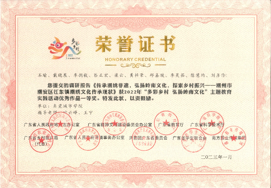 近日传来喜讯!在2022年,由广东省人民政府地方志办公室、广东省精神文明建设委员会办公室、广东省教育厅、广东省科学技术厅、广东省乡村振兴局、广东省人民政府港澳事务办公室、共青团广东省委员会广东省学生联合会、南方报业传媒集团联合组织开展的 2022年“多彩乡村 弘扬岭南文化”主题教育实践活动中,Beat365获得一等奖1项,二等奖1项,三等奖2项,优秀奖1项,并获优秀组织单位。