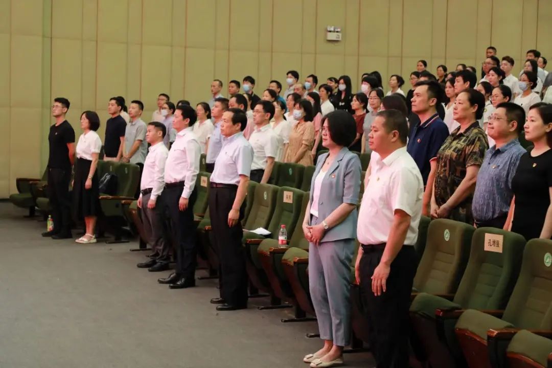 在雄壮的义勇军进行曲中,在场领导、师生党员代表庄严站立,面向五星红旗高唱国歌,激情澎湃。