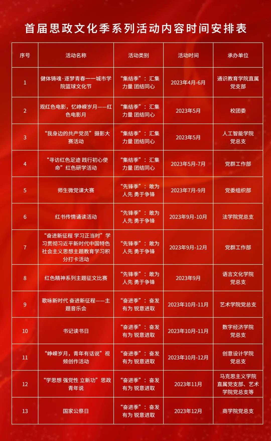 学校党委为营造“教师人人懂思政、校园处处是课堂、学生时时受教育”的“大思政”育人氛围,创新工作模式,组织开展“党建领航 初心筑梦”2023年思政文化季系列活动,开展包括:红色研学、红色电影月、“我身边的共产党员”摄影大赛、红书传情诵读、篮球文化节等13项活动,以党建引领推动学校“大思政”格局的构建,更好地促进党建工作与立德树人深度融合、相互促进。