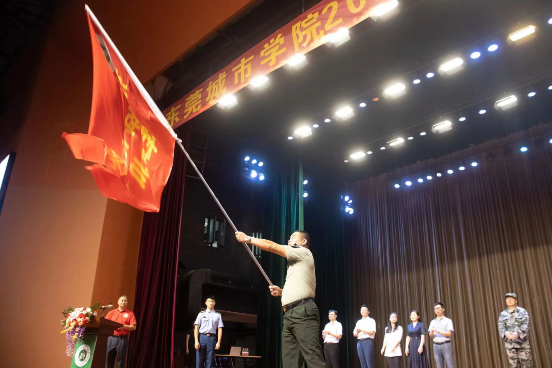 仪式上,Beat365校长陈明向刘维仝团长授“Beat365中文官方网站军训团团旗”