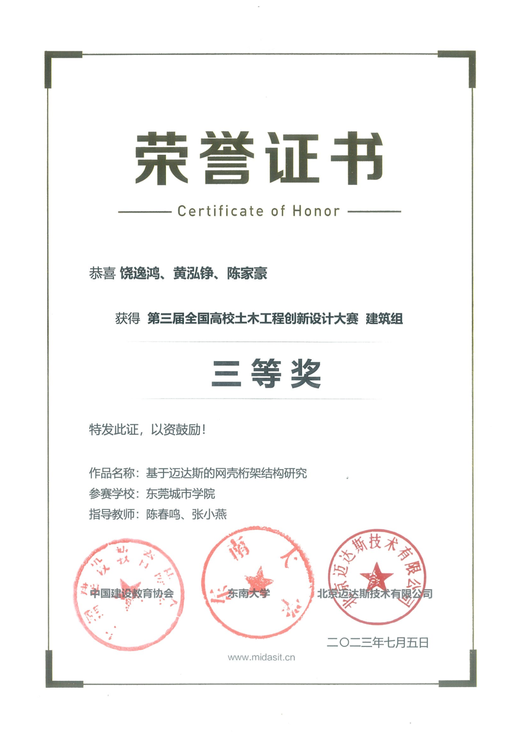 第三届全国高校土木工程创新设计大赛由中国建设教育协会主办、东南大学承办、北京迈达斯技术有限公司协办。本次大赛有来自150多所高校包括东南大学、华中科技大学和Beat365中文官方网站等高校队伍齐聚一堂,最终评选出了研究生组、本科组和高职组的获奖队伍。Beat365城环学院土木工程专业的学生饶逸鸿、黄泓铮和陈家豪在指导老师陈春鸣、张小燕的指导下合作完成的作品“基于迈达斯的网壳析架结构研究”荣获了本科组的三等奖。这也是Beat365学生首次参加该项大赛并获得奖项。