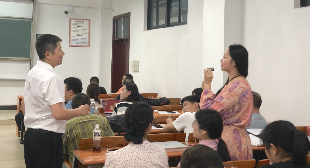 在讲课环节,陈老师以《郑伯克段于鄢》的文言语段为题进行了教学展示。陈老师讲课思路清晰,循循善诱,走下讲台,积极与听讲教师进行互动,引导、鼓励教师回答问题;陈老师的授课设计巧妙,在讲课时会穿插一些故事和文化常识,引起听者兴趣,让大家更好地领略古代汉语的魅力;陈跃老师还非常注重知识的衔接,注重知识与生活实际,特别是学生实际相联系,让深奥的古代汉语变得更加通俗易懂。