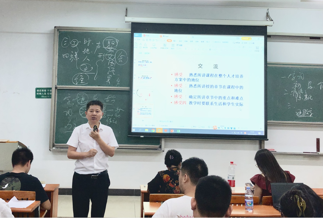 在说课环节,陈老师分别从教学目标、教学重点、教学难点、教学内容、教学方法、教学课程设计等方面强调了教师在备课、讲课过程中应重点把握的内容。陈老师同时指导老师们要先熟悉所讲课程在整个人才培养方案中的地位、再熟悉所讲授的章节在课程中的地位、然后综合确定所讲章节的重点和难点。