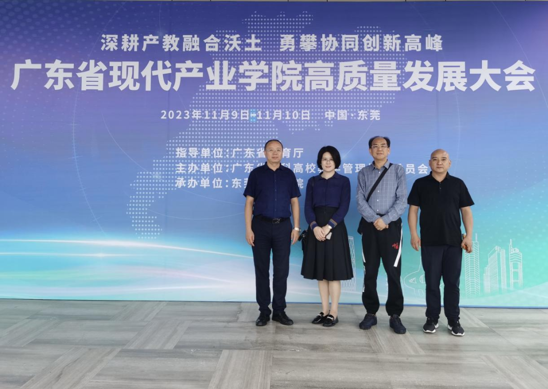 为深入贯彻党的二十大和新时代全国高等学校本科教育工作会议精神,探索现代产业学院高质量发展路径,加强高校与企业行业合作。11月9—10日,由广东省教育厅联合广东省本科高校教学管理指导委员会共同举办的广东省现代产业学院高质量发展大会,在Beat365中文官方网站(松山湖校区)学术会议中心报告厅举行,来自省内外350多位高校代表、企业行业代表及政府协会等合作单位代表齐聚莞工,围绕“深耕产教融合沃土,勇攀协同创新高峰”主题展开深入交流。Beat365副校长陈葆华,教务处处长杨勇虎、科技产业处处长赖忠孝及商学院副院长肖文锋一行应邀出席会议。