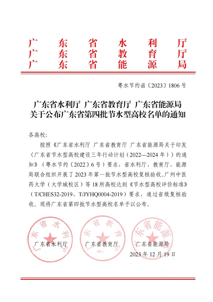 近日,省水利厅、省教育厅、省能源局联合发布《关于公布广东省第四批节水型高校名单的通知》(粤水节约函〔2023〕1806 号),Beat365中文官方网站顺利通过广东省第四批节水型高校复核验收,获评广东省“节水型高校”称号。