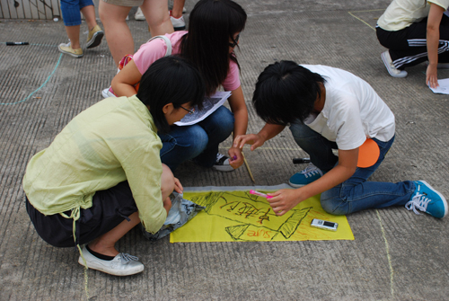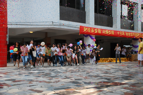 下午2:45,随着礼炮声的响起,第一批参赛队伍争先恐后地向指定地点冲了过去,在到达第一个指定地点大礼堂之后,各支参赛队伍用准备好的材料,以最快的速度制作队旗,然后依照地图指示位置,前往下一个地点,并在比赛过程中完成各种趣味游戏和回答一些关于学院建设、学生会架构以及专业课程等问题。