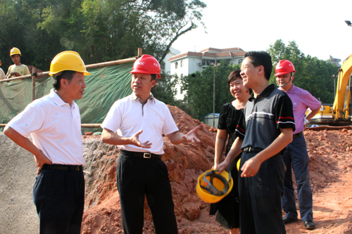 10月28日,东莞市城建工程管理局局长丁海潮在院长安少华、党委副书记朱冰及相关职能部门领导的陪同下,视察我院图书信息科技大楼建筑工地。