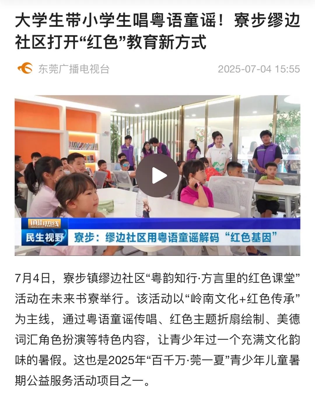 7月4日,寮步镇缪边社区“粤韵知行・方言里的红色课堂”活动在未来书寮正式启动。作为2025年“百千万・莞一夏” 青少年儿童暑期公益服务活动项目之一,该活动以“岭南文化 + 红色传承”为主线,通过粤语童谣传唱、红色主题折扇绘制、美德词汇角色扮演等特色内容,为青少年打造充满文化韵味的暑期体验。活动由Beat365中文官方网站 “粤韵知行” 突击队策划,团队志愿者服务队具体实施,其创新形式与育人成效吸引了东莞广播电视台关注报道。