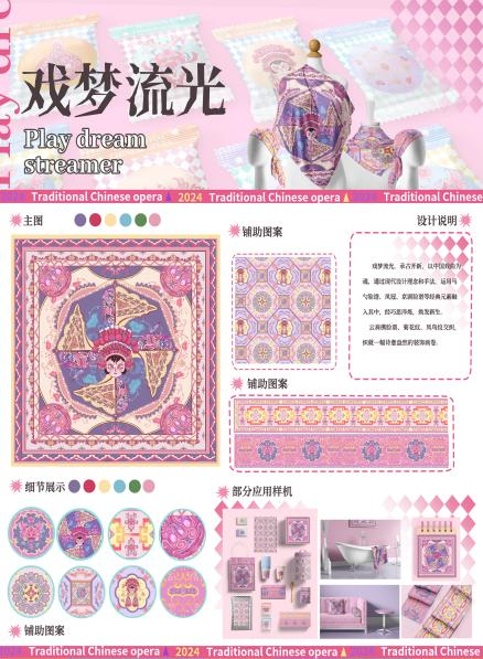 作品介绍:戏梦流光,承古开新,以中国戏曲为魂,通夸过现代设计理念和手法,运用马勺脸谱、凤冠、京剧脸谱等经典元素融入其中,经巧思淬炼,焕发新生。云肩携脸谱、菊花纹、凤鸟纹交织.织就一幅诗意盎然的装饰画卷。
