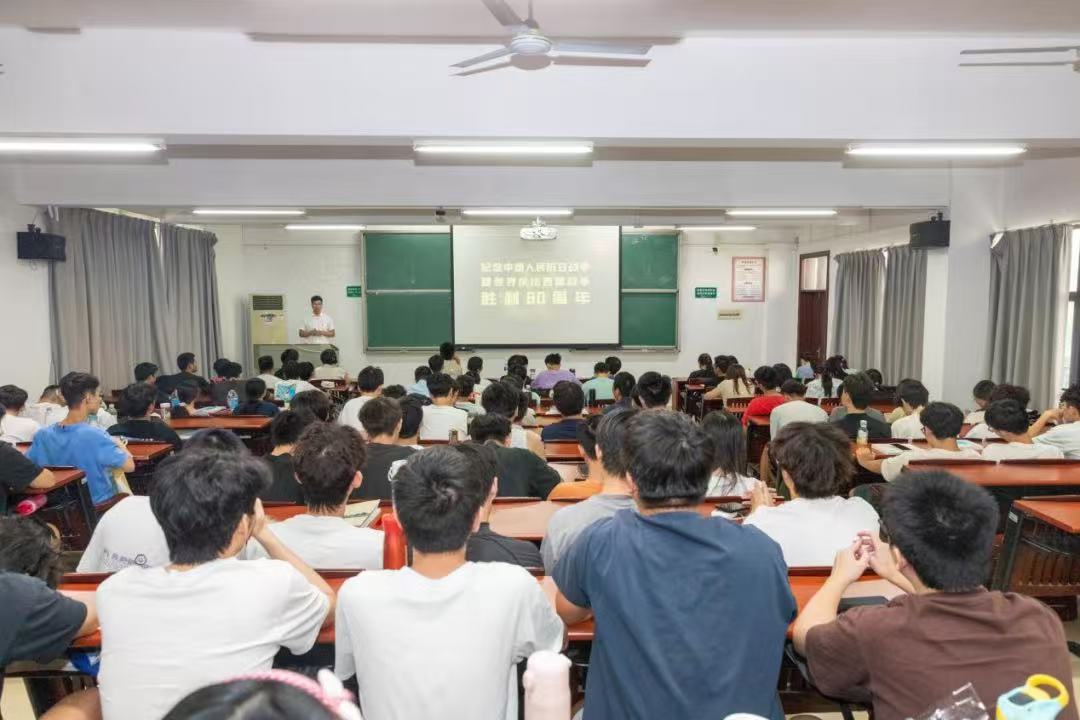 在解读伟大抗战精神的时代价值时,魏东初书记结合当前国家发展形势与青年学生的使命担当指出,新时代虽远离战火硝烟,但伟大抗战精神仍是激励我们奋勇前进的强大动力。他通过列举新时代各行各业青年在科技创新、乡村振兴、志愿服务等领域的奋斗案例,引导学生深刻认识到:“青年一代的理想信念、精神状态、综合素质,直接关系到国家前途和民族命运。纪念抗战胜利,不仅是为了铭记历史、缅怀先烈,更是为了从历史中汲取力量,以坚定的民族信念扛起时代赋予的责任。”