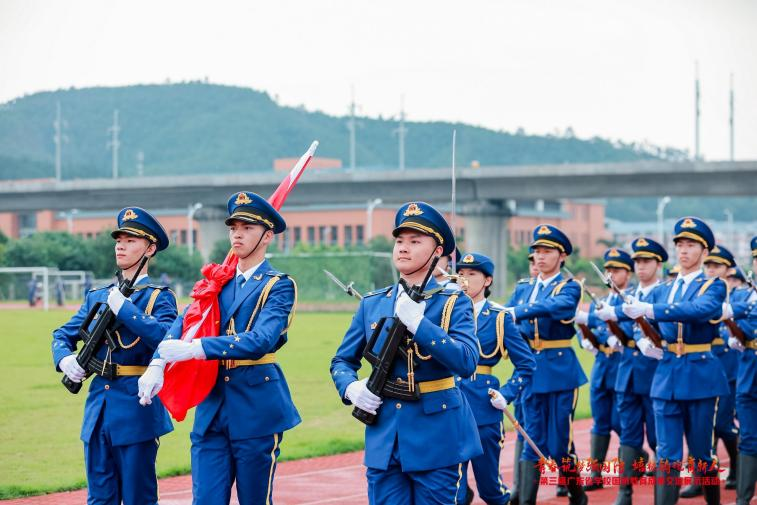 为打破国防教育“单向灌输”模式,学校创新打造“宣讲+、服务+、竞赛+”三维实践矩阵,推动育人价值从“被动接收”向“主动输出”转变。“宣讲+”层面成立征兵宣讲团,组织退伍学生深入课堂、学生社区、合作中学及线上平台,开展“征兵政策解读”“我的入党初心”“军旅故事分享”等主题宣讲300余场,以亲身经历激发青年爱国报国情怀;“服务+”层面主动承接开学迎新、校庆等校园大型活动保障,赴粤西山区开展“爱国情浓映乡垄,国旗照耀童心红”儿童国防教育公益课程,2024年9月应邀为广东酒店职院提供军训承训服务获师生高度认可,累计开展应急服务、社区宣讲等志愿活动超3000小时,彰显高校社会担当;“竞赛+”层面组建国旗护卫队,在广东省学校国旗护卫队展示交流活动中屡获佳绩,2019年、2021年两度斩获团体一等奖,2023年获评本科组团体二等奖、方队动作比赛一等奖等多项荣誉,队员们克服学业压力刻苦训练,展现出极强的纪律意识与团队精神,成为国防教育成果的生动缩影。