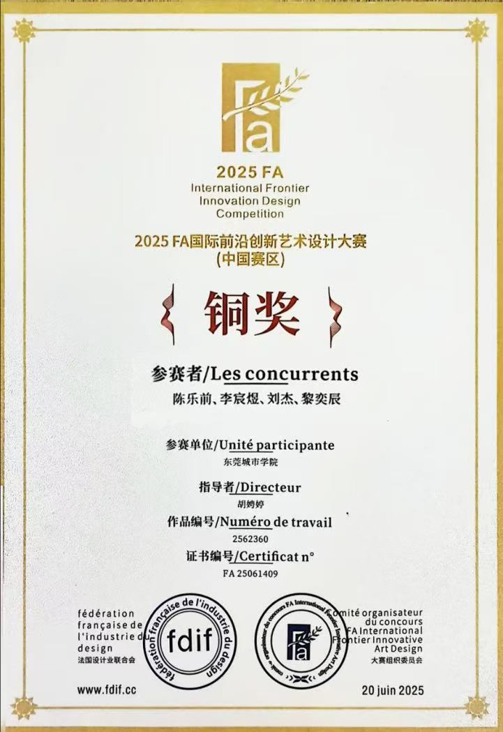 捷报传来!在刚刚揭晓的2025 FA国际前沿创新艺术设计大赛(中国赛区)中,由胡娉婷老师指导的、城建与智造学院陈乐前、李宸煜、刘杰、黎奕辰四位同学共同创作的参赛作品,凭借其深厚的文化内涵与前沿的设计创新,在激烈竞争中脱颖而出,荣获中国赛区铜奖!